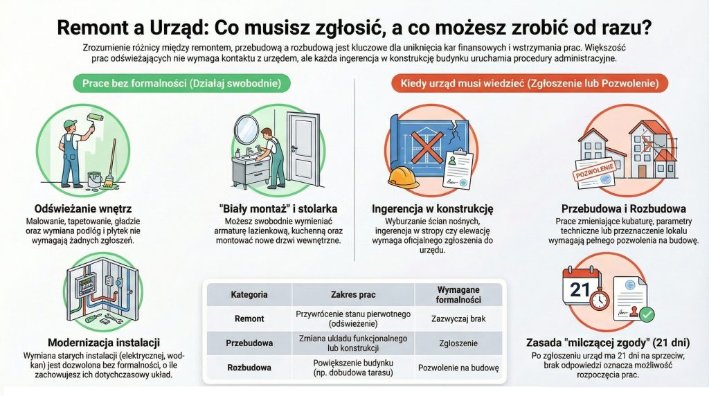 Dlaczego to takie ważne? Bo remont często przeprowadzisz bez formalności, ale przebudowa i rozbudowa prawie zawsze uruchamiają procedury urzędowe.